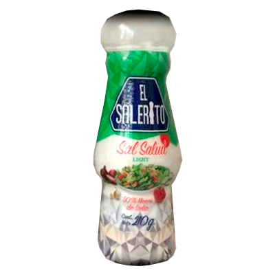 Sal entrefina a base de 50% cloruro de Potasio 50% sal común seleccionada (cloruro de sodio) manteniendo el sabor tradicional de “EL SALERITO”