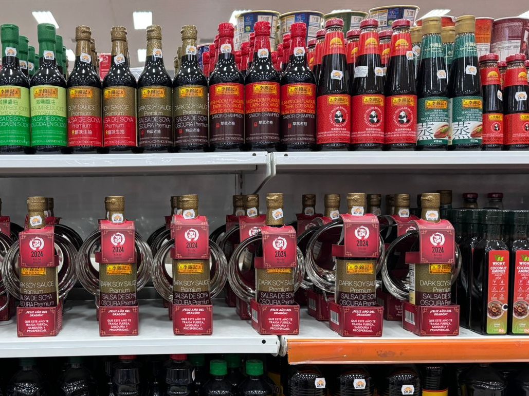 Promoción de Salsa Soya Oscura Premium y el Plato Balti, en exhibidores de un supermercado en Santa Cruz.